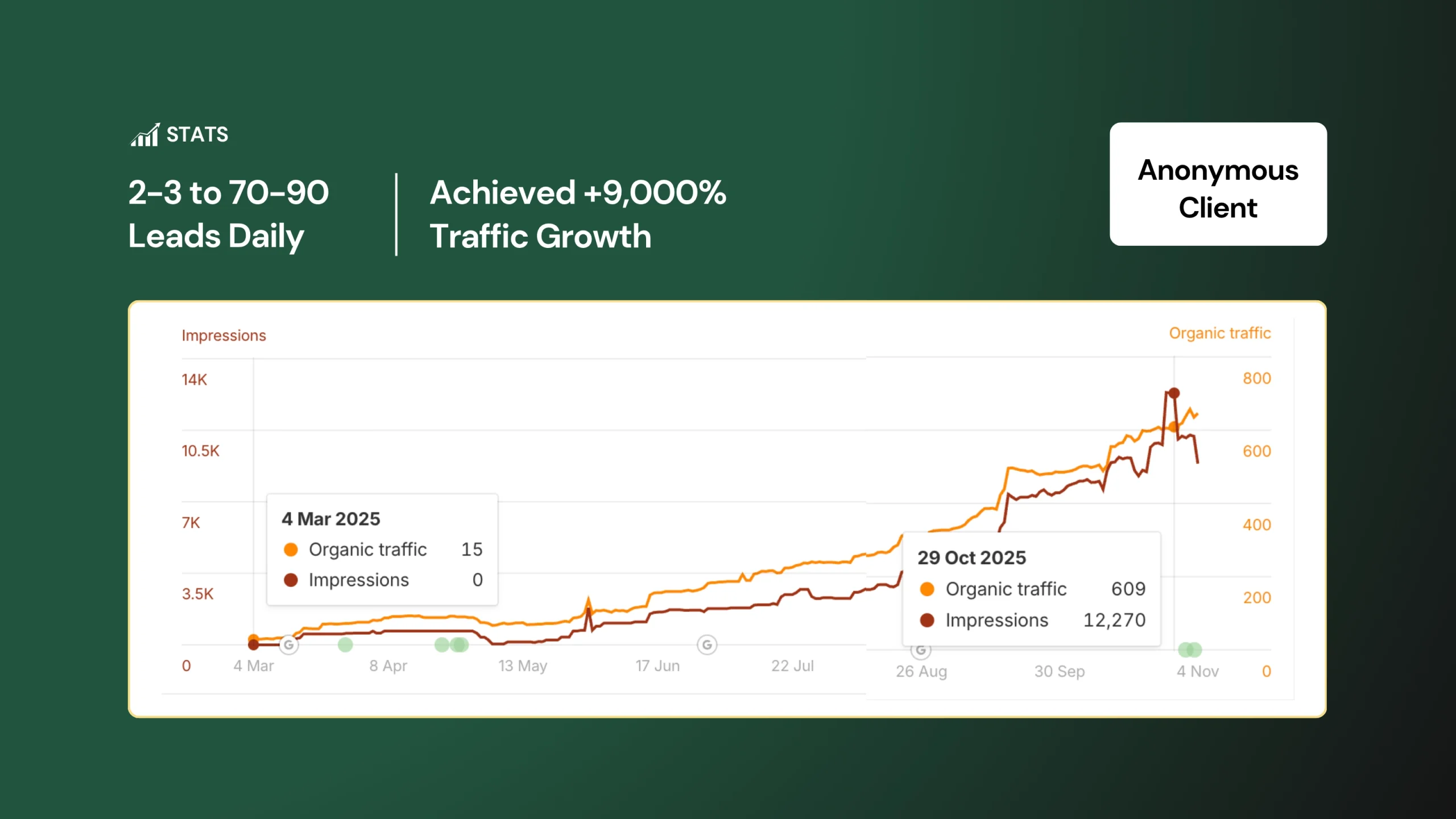 | Monthly Organic Traffic | ≈ 100 visits | 10,000+ sessions | + 9,900 % |